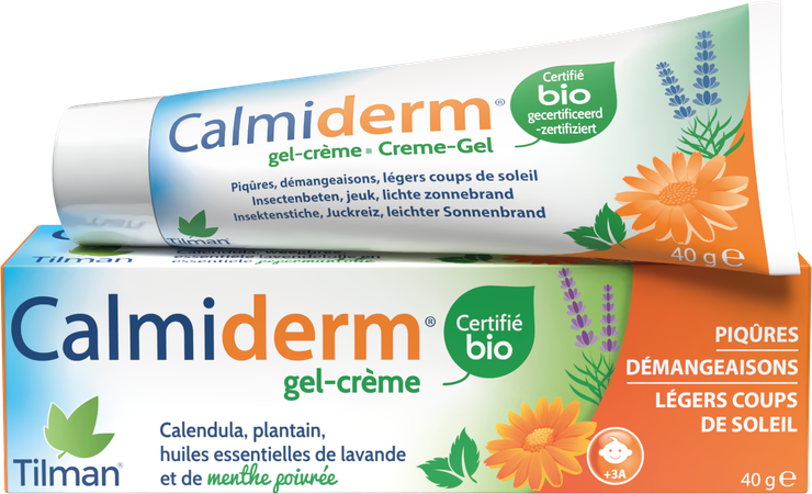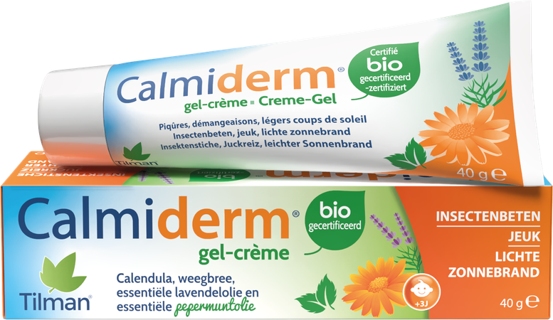 Gecertificeerd biologische crème De 3-in-1-crème met de hoogste concentratie actieve plantaardige ingrediënten Calmiderm gecertificeerd biologische crème verzacht jeuk en verlicht irritaties zoals roodheid, schrammen, insectenbeten, prikken van planten en lichte zonnebrand. Met zijn voedende textuur en actieve plantaardige ingrediënten helpt de crème de huid hydrateren en regenereren. Ingrediënten per tube : Aqua • Lavandula angustifolia flower water*• Glyceryl stearate • Glycerin • C15-19 Alkane • Xylityl sesquicaprylate • Mentha piperita oil*• Acacia Senegal gum • Xanthan gum • Gellan gum • Calendula officinalis flower extract*• Lavandula augustifolia oil* • Plantago lanceolata leaf extract* • Anhydroxylitol • Cellulose • Tocopherol • Helianthus annuus seed oil • Citric acid • Sodium benzoate • Potassium sorbate • Sodium hydroxide • Menthol • Linalool • Limonene • Geraniol. *Ingrediënten uit biologische landbouw : 99,9% van het totaal is van natuurlijke oorsprong - 22,9% van de totale ingrediënten is afkomstig van biologische landbouw Calendula kalmeert de opperhuid. Essentiële olie van pepermunt kalmeert jeuk en verfrist. Essentiële olie van lavendel kalmeert en helpt de huid regenereren. Weegbree verzacht beten en wonden. Insectenbeten - Jeuk - Lichte zonnebrandOmschrijving