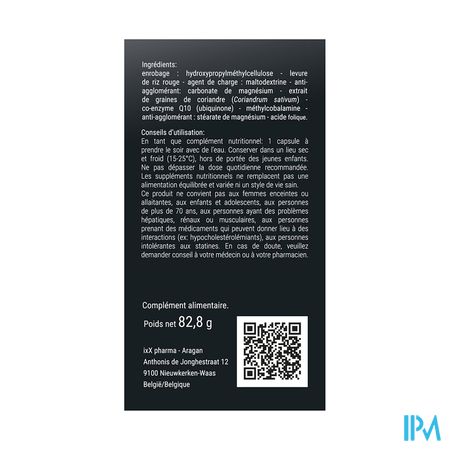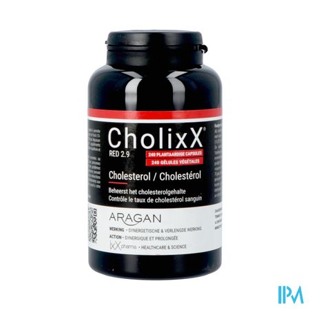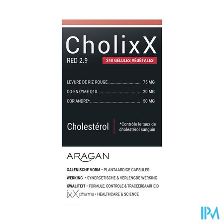 CholixX RED 2.9 is een high tech voedingssupplement. Aangewezen voor de beheersing van uw cholesterol. Rode gist rijst draagt bij tot een gezonde cholesterol, bevat tevens co-enzym Q10. Cholesterol 1 plantaardige capsule per dag. Samenstelling per plantaardige capsule: 75 mg rode gist rijst waarvan 2.9 mg monacolines, 50 mg extract van Coriandrum, 20 mg co-enzym(e) Q10, 200 µg foliumzuur (100 % RI), 2,5 µg vitamine B12 (100 % RI). Cholixx Red 2.9 Caps 240 is een voedingssupplement, verkrijgbaar in uw buurtapotheek of online apotheek. Neem niet meer dan de aanbevolen dagelijkse dosis vermeld op de verpakking. Het vervangt geen gezonde levensstijl en gevarieerde en evenwichtige voeding. Vraag raad aan uw apotheker. Het product altijd buiten het bereik van kinderen houden.Omschrijving