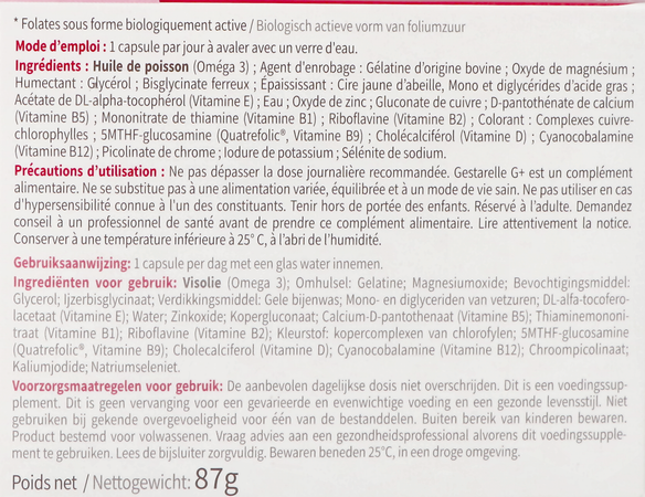 Met één capsule per dag levert Gestarelle G + ook vele andere essentiële elementen, zoals vetzuren (gezuiverde en gestabiliseerde Omega 3 uit visolie), jodium, ijzer en vitamines.