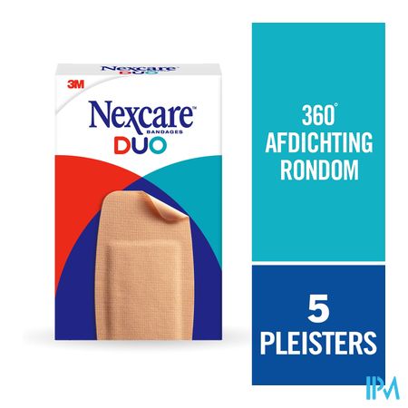 Bevat geen natuurlijk rubberlatex Ervaar de volgende keer wanneer u kleine wondjes of schaafplekken ontdekt, een pleister zoals die zou moeten zijn: sterk, maar toch zacht. Met Nexcare™ DUO pleisters hoeft u niet langer een compromis te zoeken tussen pijnloze verwijdering of een pleister die op zijn plaats blijft zitten totdat hij eraf mag. U krijgt nu het beste van beide. Zeg maar dag tegen die grimas! De lang houdende kleeflaag houdt de pleister tot wel 24 uur op zijn plaats, maar is zacht genoeg om gemakkelijk verwijderd te worden zonder lijmresten achter te laten. De flexibele strips passen zich aan de vorm van de huid aan: ze rekken en buigen met uw bewegingen mee, terwijl het kompres de wond beschermt. 360°-afsluiting rondom het kompres bedekt en beschermt kleine wondjes. Nexcare™ DUO-pleisters mogen niet ontbreken in uw EHBO-kit.Samenstelling