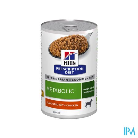 Hill's Prescription Diet Metabolic Hondenvoer met Kipsmaak is een volledig dieetvoeder voor de vermindering van overgewicht en voor de instandhouding van een gezond gewicht bij volwassen honden. Dit voeder heeft een laag energiegehalte. Zelfs een pondje teveel kan invloed hebben op de levenskwaliteit van je hond. Het kan de band met jou en je gezin beïnvloeden, want extra gewicht betekent minder speeltijd, beperkt de mobiliteit en heeft invloed op de levenslange algemene gezondheid van je hond. Het behoud van een ideaal gewicht kan de levensverwachting helpen beïnvloeden door het risico op gewichtsgerelateerde aandoeningen te verminderen. SAMENSTELLING: Vlees en dierlijke bijproducten (kip 3%), granen, bijproducten van plantaardige oorsprong, groenten, eieren en eibijproducten, zaden, oliën en vetten, mineralen. ANALYTISCHE BESTANDDELEN: Eiwit 6,7%, Vetgehalte 2,9%, Ruwe celstof 3,4%, Ruwe as 1,5%, Vocht 76,1%, Calcium 0,18%, Fosfor 0,13%, Natrium 0,09%, Kalium 0,23%, Magnesium 0,03%; per kg: Vitamine A 27.629 IE, Vitamine D3 230 IE. TOEVOEGINGSMIDDELEN PER KG: Nutritionele toevoegingsmiddelen: 3b103 (IJzer) 10,5 mg, 3b202 (Jodium) 0,3 mg, 3b405 (Koper) 1,7 mg, 3b502 (Mangaan) 2,3 mg, 3b603 (Zink) 26,9 mg. Metaboliseerbare energie: 811 kcal/kg. Voor kleine rassen, middelgrote rassen en grote rassen. Volwassen, Senior Met kipsmaak Dieetvoeding voor het verminderen van overgewicht en het handhaven van een gezond gewicht bij volwassen honden.Omschrijving