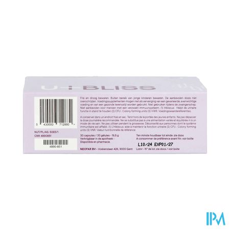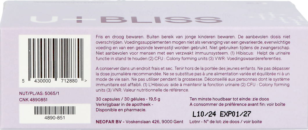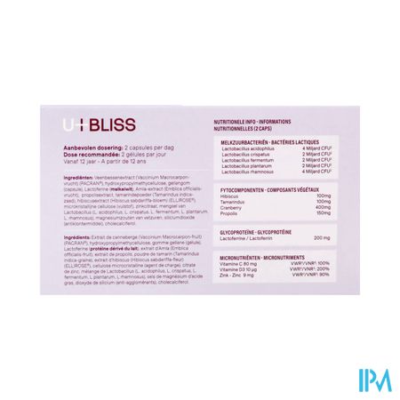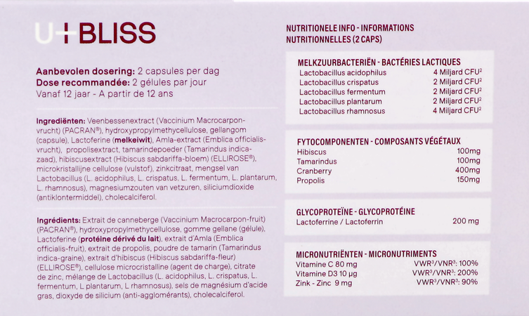 Urinewegen en blaasfunctie U-bliss is het meest complete supplement op de markt die de urinewegen op een natuurlijke manier gezond houdt. Minstens 15 dagen 2 capsules per dag, daarna een onderhoudsdosis van 1 capsule per dag Neem de capsules(s) in met water of een andere drank. Bij eventuele slikproblemen kan de capsule opengebroken worden en kan de inhoud opgelost worden in een beetje water. In dit geval kan u-bliss best op een lege maag worden ingenomen. Vegetarisch Melkzuurbacteriën U-bliss bevat goedaardige bacteriën die via een zuurresistente capsule de darm levend bereiken. De aanbevolen startdosis bevat maar liefst 14 miljard kolonievormende eenheden. Fyto componenten U-bliss bevat hoogwaardige fyto componenten van onder andere Cranberry, Tamarinde, Hibiscus en Propolis. Waar mogelijk worden gepatenteerde ingrediënten (PACRAN® & ELLIROSE®) gebruikt die hun nut hebben bewezen in klinische studies. Glycoproteïne Lactoferrine is een eiwit dat voorkomt in moedermelk en andere lichaamsvloeistoffen. De extractie van lactoferrine uit melk is intensief, waardoor lactoferrine soms in sub-optimale concentraties wordt toegevoegd. Met een aanbreng van 200 milligram per dagdosis staat U-bliss ver op kop! Micronutriënten Vitamine C, D en zink dragen allen bij tot een normale werking van het immuunsysteem. U-bliss brengt deze micronutriënten aan in goed opneembare & darmvriendelijke vorm. U-bliss Maagsapresist Caps 30 is een voedingssupplement, verkrijgbaar in uw buurtapotheek of online apotheek. Neem niet meer dan de aanbevolen dagelijkse dosis vermeld op de verpakking. Het vervangt geen gezonde levensstijl en gevarieerde en evenwichtige voeding. Vraag raad aan uw apotheker. Het product altijd buiten het bereik van kinderen houden.Indicaties