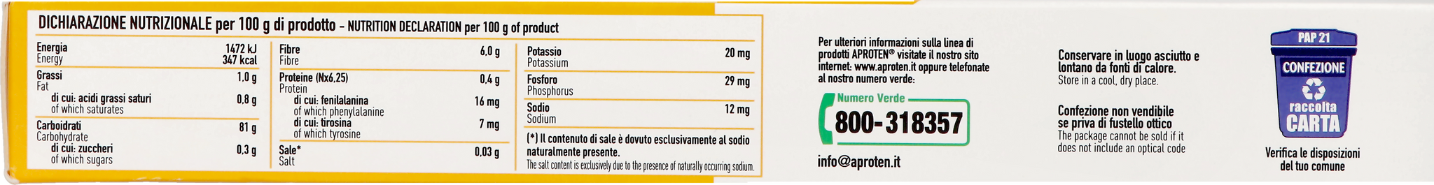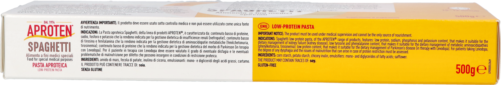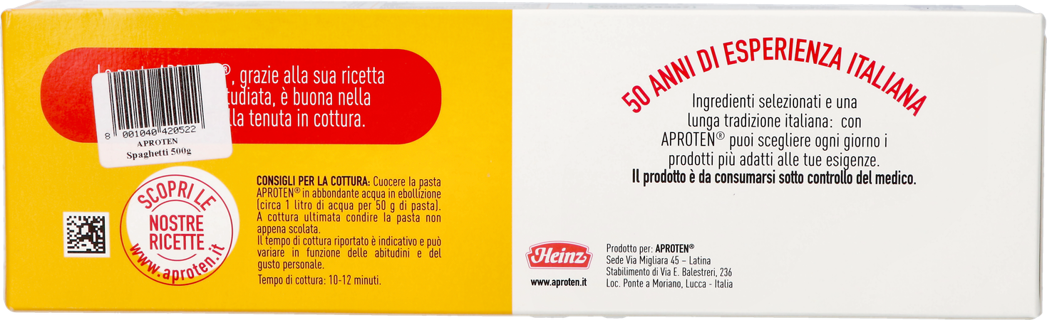 Aproten Spaghetti 500g 5454 Revogan is een voedingssupplement, verkrijgbaar in uw buurtapotheek of online apotheek. Neem niet meer dan de aanbevolen dagelijkse dosis vermeld op de verpakking. Het vervangt geen gezonde levensstijl en gevarieerde en evenwichtige voeding. Vraag raad aan uw apotheker. Het product altijd buiten het bereik van kinderen houden. Aproten deegwaren spaghetti, eiwitarm. Maïszetmeel, aardappelzetmeel, inuline, emulgator: mono- en diglyceriden van vetzuren, aroma: carthaam. Kan soja bevatten. 1 liter water per 50g pasta. 11 minuten laten koken. Vetarm (<= 3g V/ 100g of 1,5g V/ 100ml) Eiwitarm Vezelrijk (= min 6g/100g of 3g/100 kcal)Belangrijke info