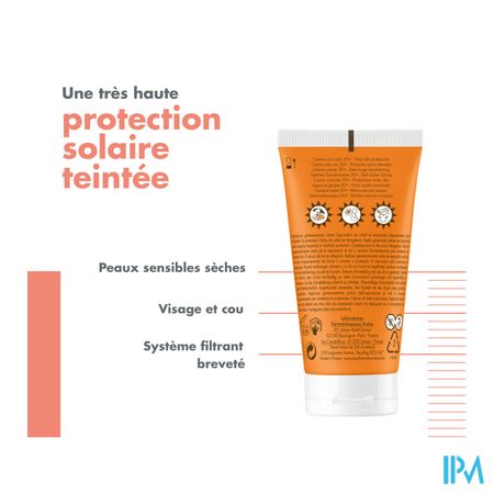 Hoge getinte zonbescherming voor de droge tot zeer droge gevoelige huid. Zeer brede UVB-UVA en blauw licht bescherming. Fotostabiel. Eau Thermale Avène is geheel gewijd aan de ontwikkeling van huidverzorgingsproducten die doelgericht herstellend en zeer weldadig inwerken op de gevoelige huid, om zo het huidongemak optimaal te verlichten en de algehele levenskwaliteit duurzaam te verbeteren. https://www.eau-thermale-avene.fr/votre-peau/peau-et-soleil/choisir-la-bonne-protection-solaire De getinte SPF 50+ crème biedt een dagelijkse breedspectrum zonbescherming tegen UV-stralen en blauw licht tot 450nm, dat de huidveroudering versnelt. Het is ideaal voor de droge en gevoelige gezichtshuid. De fluweelzachte, smeltende textuur hydrateert de gezichtshuid tot wel 8 uur lang* en zorgt voor een gevoede huid die zacht aanvoelt. De natuurlijke kleur van de formule past bij de meeste huidtinten en zorgt dagelijks voor een egale teint, waardoor het een uitstekende basis is voor make-up. De formule is bovendien ook waterbestendig. *Biometrisch HI kinetics onderzoek, eenmalige toepassing, 22 personen • ZONNEBESCHERMING: het bevat zonnefilters voor een zeer brede en stabiele UVB-/UVA-bescherming. • ANTI-OXIDEREND: zodat de huidcellen beschermd blijven tegen de schadelijke invloeden van vrije radicalen. • TEINT-EGALISERENDE WERKING: zorgt voor een effen, heldere en stralende teint. • WATERBESTENDIG: zodat de huid ook tijdens de zwembeurt optimaal beschermd blijft tegen de schadelijke effecten van zonlicht. AVENE THERMAL SPRING WATER (AVENE AQUA). C12-15 ALKYL BENZOATE. DIETHYLAMINO HYDROXYBENZOYL HEXYL BENZOATE. ETHYLHEXYL TRIAZONE. GLYCERIN. WATER (AQUA). PHENYLENE BIS-DIPHENYLTRIAZINE. BIS-ETHYLHEXYLOXYPHENOL METHOXYPHENYL TRIAZINE. TITANIUM DIOXIDE (CI 77891). POTASSIUM CETYL PHOSPHATE. MYRISTYL ALCOHOL. ORYZA SATIVA (RICE) STARCH (ORYZA SATIVA STARCH). STEARYL ALCOHOL. ISONONYL ISONONANOATE. VP/EICOSENE COPOLYMER. ALUMINA. BENZOIC ACID. CAPRYLIC/CAPRIC TRIGLYCERIDE. CAPRYLYL GLYCOL. FRAGRANCE (PARFUM). GLYCERYL BEHENATE. GLYCERYL DIBEHENATE. IRON OXIDES (CI 77492,CI 77491,CI 77499). ISOPROPYL MYRISTATE. ISOPROPYL TITANIUM TRIISOSTEARATE. MYRISTYL GLUCOSIDE. POLYHYDROXYSTEARIC ACID. PPG-1-PEG-9 LAURYL GLYCOL ETHER. PROPYLENE CARBONATE. STEARALKONIUM HECTORITE. TERPINEOL. TOCOPHERYL GLUCOSIDE. TRIBEHENIN. VANILLIN. XANTHAN GUMIndicaties