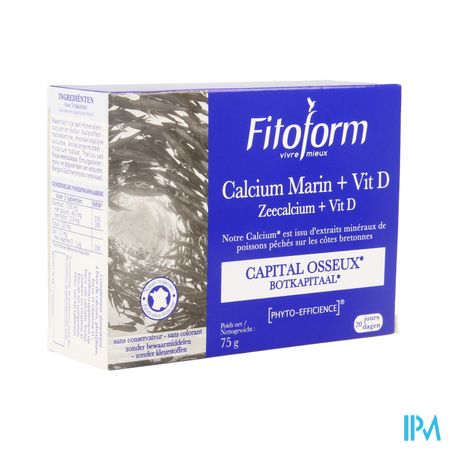 Calcium Marin Comp 60 Fitoform is een voedingssupplement, verkrijgbaar in uw buurtapotheek of online apotheek. Neem niet meer dan de aanbevolen dagelijkse dosis vermeld op de verpakking. Het vervangt geen gezonde levensstijl en gevarieerde en evenwichtige voeding. Vraag raad aan uw apotheker. Het product altijd buiten het bereik van kinderen houden. Calcium en fosfor dragen bij tot de instandhouding van normale botten. INGREDIËNTEN voor 3 tabletten (Aanbevolen dagelijkse dosis) 3 tabletten per dag (bij voorkeur 's ochtends) innemen met een glas water tijdens de maaltijd, gedurende 20 dagen. Niet aanbevolen voor mensen met schildklierproblemen.Belangrijke info