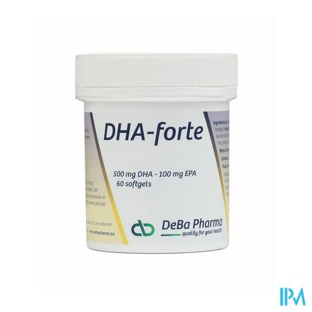 Visolie (60% omega-3-vetzuren) DHA EPA Vit. E (mixed tocoferolen) (30% ADH) 1 à 3 softgels per dag, of zoals voorgeschreven. Dit product bevat geen lactose, geen gluten en is vrij van bewaarmiddelen, kleur- en smaakstoffen. DHA en EPA zijn twee belangrijke omega 3-vetzuren. De grootste concentratie van DHA in het lichaam bevindt zich in de hersenen en het zenuwstelsel. DHA draagt daarom bij tot de instandhouding van de normale hersenfunctie. In combinatie met Luteïne draagt het ook bij tot de instandhouding van een normaal gezichtsvermogen. Dha Forte Caps 60x500mg Deba is een voedingssupplement, verkrijgbaar in uw buurtapotheek of online apotheek. Neem niet meer dan de aanbevolen dagelijkse dosis vermeld op de verpakking. Het vervangt geen gezonde levensstijl en gevarieerde en evenwichtige voeding. Vraag raad aan uw apotheker. Het product altijd buiten het bereik van kinderen houden.Samenstelling