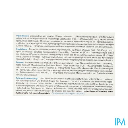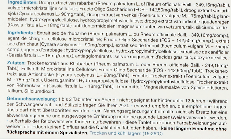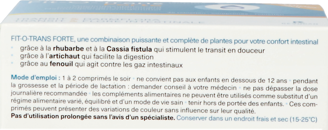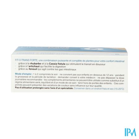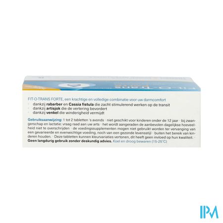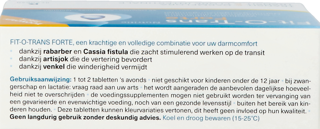 1 tot 2 tabletten 's avonds Droog extract van rabarber (Rheum palmatum L. of Rheum officinale Baill. - 349,16mg/tabl.); vulstof: microkristallijne cellulose; Fructo Oligo Sacchariden (FOS -142,50mg/tabl.); droog extract van artisjok (Cynara scolymus L.- 90mg/tabl.); droog extract van venkel (Foeniculum vulgare M.-75mg/tabl.); glansmiddelen: hydroxypropylcellulose, hydroxypropylmethylcellulose; droog extract van Cassia fistula (Cassia fistula L. -18mg/tabl.); antiklontermiddelen: magnesiumstearaat, talk, siliciumdioxide. Fit-O-Trans Forte is een krachtige en volledige combinatie voor uw darmcomfort. Nutritic Fit-o-trans Forte Tabl 45 Revogan is een voedingssupplement, verkrijgbaar in uw buurtapotheek of online apotheek. Neem niet meer dan de aanbevolen dagelijkse dosis vermeld op de verpakking. Het vervangt geen gezonde levensstijl en gevarieerde en evenwichtige voeding. Vraag raad aan uw apotheker. Het product altijd buiten het bereik van kinderen houden.Indicaties