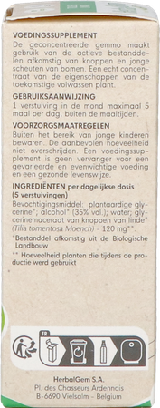 1 verstuiving maximaal 5 keer per dag. Knoppen van linde. Herbalgem Linde Bio Spray 15ml is een voedingssupplement, verkrijgbaar in uw buurtapotheek of online apotheek. Neem niet meer dan de aanbevolen dagelijkse dosis vermeld op de verpakking. Het vervangt geen gezonde levensstijl en gevarieerde en evenwichtige voeding. Vraag raad aan uw apotheker. Het product altijd buiten het bereik van kinderen houden.Omschrijving