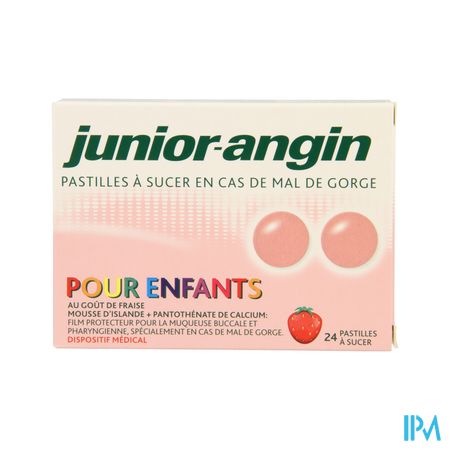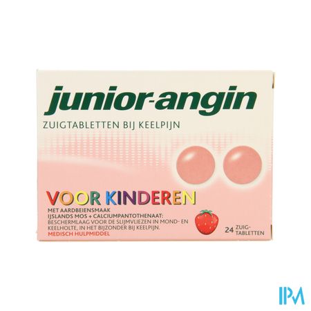 Bij keelpijn Voor kinderen Volwassenen en kinderen vanaf 4 jaar kunnen naar behoefte iedere 2-3 uur een tablet opzuigen, maximaal 3 tabletten per dag. De Junior Angin zuigtabletten zijn een medisch hulpmiddel ter bescherming van het slijmvlies in mond- en keelholte, in het bijzonder bij keelpijn. Met aardbeiensmaak. Junior Angin Zuigtabletten 24 is een voedingssupplement, verkrijgbaar in uw buurtapotheek of online apotheek. Neem niet meer dan de aanbevolen dagelijkse dosis vermeld op de verpakking. Het vervangt geen gezonde levensstijl en gevarieerde en evenwichtige voeding. Vraag raad aan uw apotheker. Het product altijd buiten het bereik van kinderen houden.Indicaties