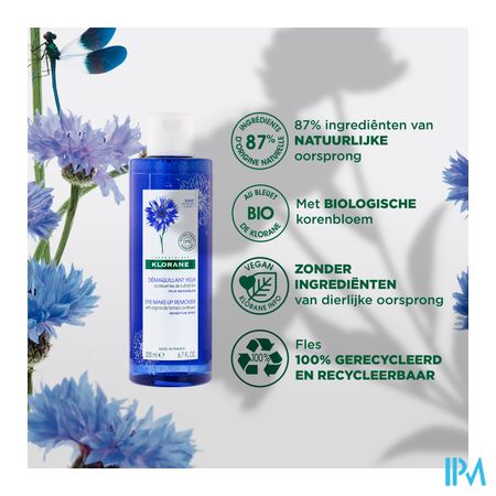 Breng met een wattenschijfje aan op het hele gezicht en op de ogen. Ga van de binnenste naar de buitenste ooghoek en vervolgens van de wimperaanzet naar de punt, om make-up optimaal te verwijderen. Zonder naspoelen. De Oog make-up remover met BIO Korenbloem van Klorane verwijdert make-up op milde en doeltreffende wijze* van gevoelige ogen en is ideaal voor mensen die contactlenzen dragen. De formule bevat 87% aan natuurlijke ingrediënten, waaronder biologisch geteelde korenbloem, en respecteert de kwetsbaarheid van de ogen en de gevoelige oogleden. De pH-waarde lijkt op die van tranen en prikt daarom niet in de ogen. *Verwijdert make-up doeltreffend: 92% tevreden - gebruikstest uitgevoerd bij 64 vrouwen met gevoelige ogen, waaronder vrouwen die contactlenzen dragen. • Verwijdert make-up: verwijdert in alle zachtheid** make-up en onzuiverheden. • Respecteeert: deze formule is getest onder dermatologisch en oftalmologisch toezichten heeft een pH-waarde identiek aan die van tranen, zo prikt het product niet in de ogen. • Verzacht: de formule bevat biologische korenbloem met verzachtende eigenschappen, ideaal voor gevoelige ogen. **Mild reinigend: 84% tevreden - gebruikstest uitgevoerd bij 64 vrouwen met gevoelige ogen, inclusief mensen die contactlenzen dragen. WATER (AQUA). BUTYLENE GLYCOL. CENTAUREA CYANUS FLOWER WATER. POLOXAMER 184. HEXYLENE GLYCOL. PEG-6 CAPRYLIC/CAPRIC GLYCERIDES. CITRIC ACID. PHENETHYL ALCOHOL. SODIUM CHLORIDE. TRISODIUM ETHYLENEDIAMINE DISUCCINATE OntschminkingGebruik