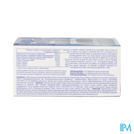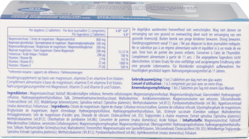Magnesiumcitraat: Vulstof: Microkristallijne cellulose, Vernette celulosegom; Magnesiumglycerofosfaat; Magnesiumbisglycinaat, Glansmiddel: Hydroxypropylcellulose, Hydroxypropylmethylcellulose, Talk, Zetneelnatriumoctenyl-03 succinaat; Maltodextrine, Antiklontermiddelen: Magnesiumzouten van vetzuren, Silicium dioxide, Cholecalciferol (vit. D3); Middellange ketenvetzuren; Spirulina-extract (Spirulina platensis); Methylcobalamine (vit. B12); Pyridoxinehydrochloride (vit 86); Appelconcentraat (malus domestica); Foliumzuur.